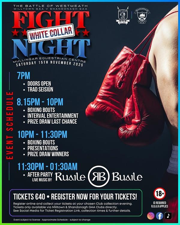 Tickets for the White collar fight night fundraiser are available for collection this Saturday evening 18th October in Shandonagh Clubhouse 6pm to 7.30pm.