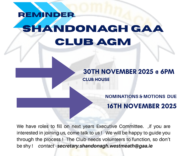 Contact :secretary.shandonagh.westmeath@gaa.ie if you would like more information on submitting a Nomination or Motion for consideration at this years AGM